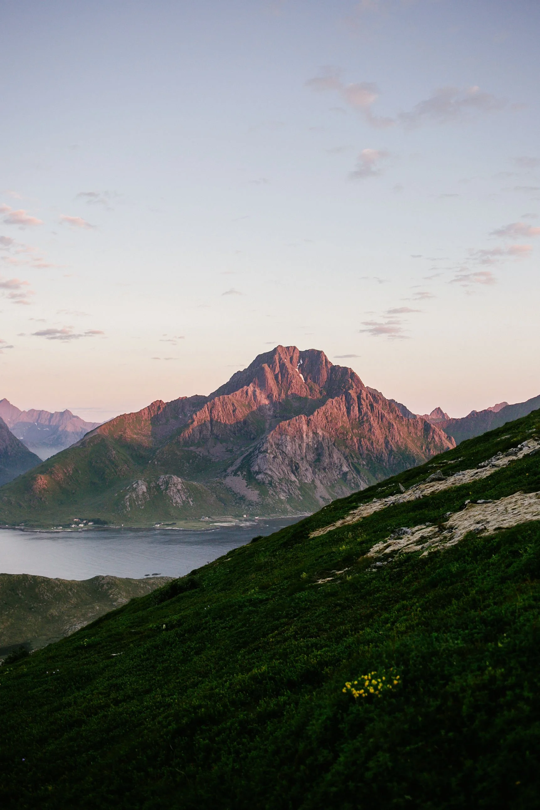 3AM, up top a peak, all alone with my dearest friends. We played card games & danced with palpable joy. And sang. And sat in humbling awe. We struggled to tuck into our tent because it was silly to think we could possibly sleep when the night was as beautiful as this. The land felt so quiet and the subdued hues of blues in the sky along with the warm tones of midnight sun pinks lighting the peaks created the calmest feeling in the air.